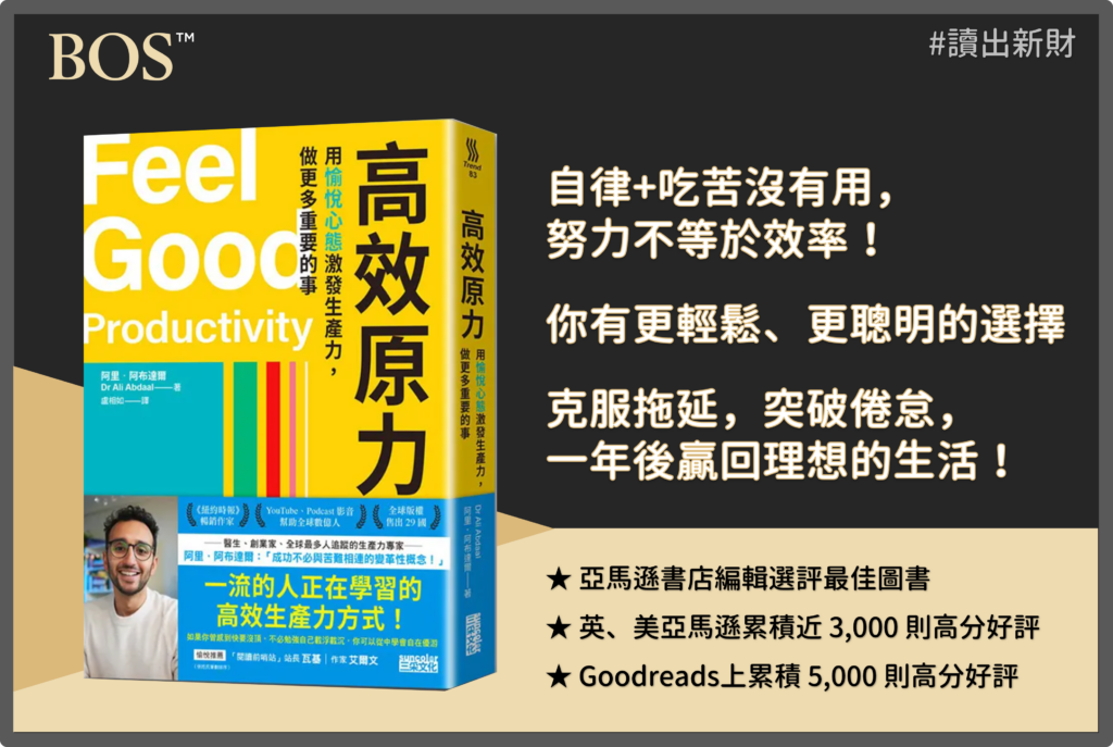 這個故事的主角正是本書作者阿里·阿布達爾。他透過多年來的經歷與實踐,發現傳統「吃苦耐勞」的成功法則,在現代高壓的職場和投資世界中已不再適用,反而讓自己身心俱疲。相反地,他強調:真正的成功源於搞懂如何讓辛苦的差事變得更舒心。這就是他所倡導的「愉悅生產力」(Feel-Good Productivity)理念:先提升自身的幸福感,再運用這份快樂來驅動專注力與動機。