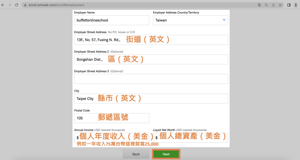 年度收入和個人資產:請注意金額應以美元為單位。例如,你的年收入為75萬台幣,換算為美元後填寫為25,000美元。